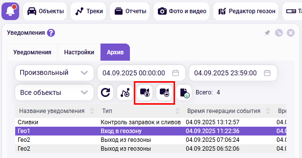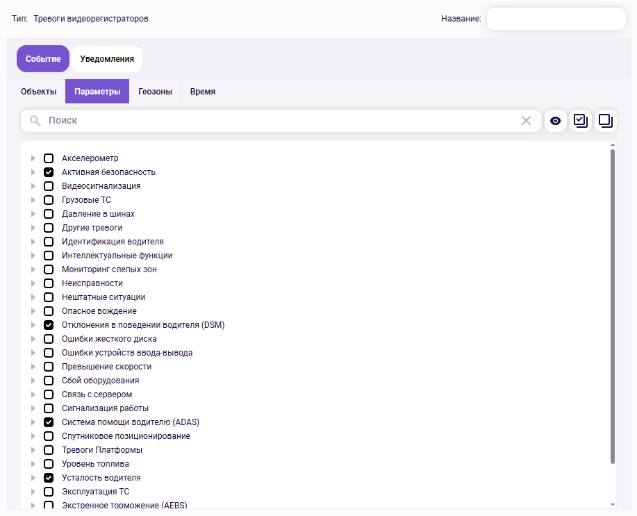 Для включения этого типа уведомлений нужно создать уведомление "Тревоги видеорегистраторов":
