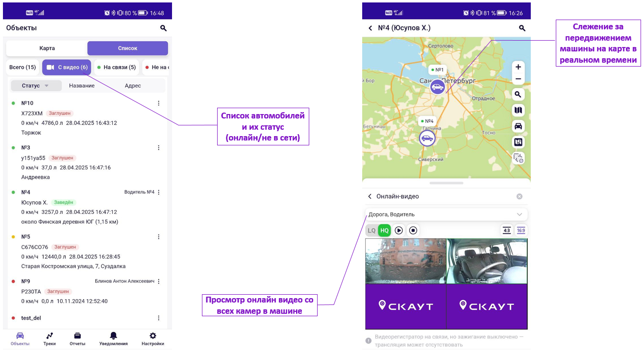 - ФИО водителя, который сейчас управляет машиной (эта информация берется с телематического терминала, который связан с видеорегистратором, а не с самого ВР), если он заведен в систему СКАУТ.